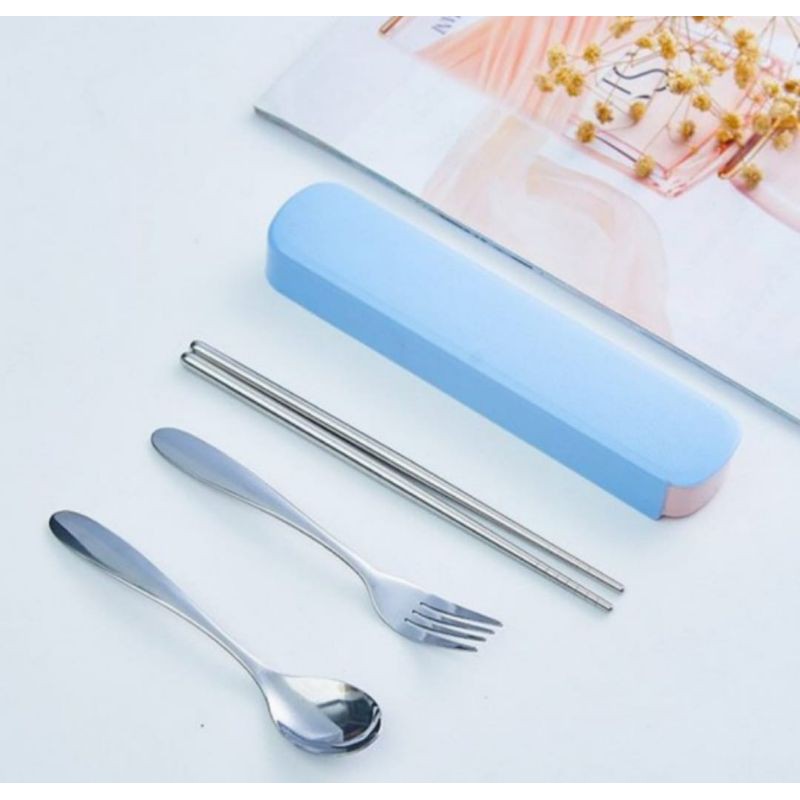 Dengan sendok, garpu, dan sumpit dalam 1 paket ini, anda bisa merasa lega makan di luaran sana.